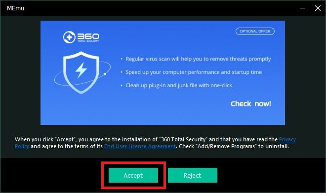 Bước 3: Tiếp theo, bạn cần chọn Accept để chấp thuận điều khoản sử dụng của Memu Play.